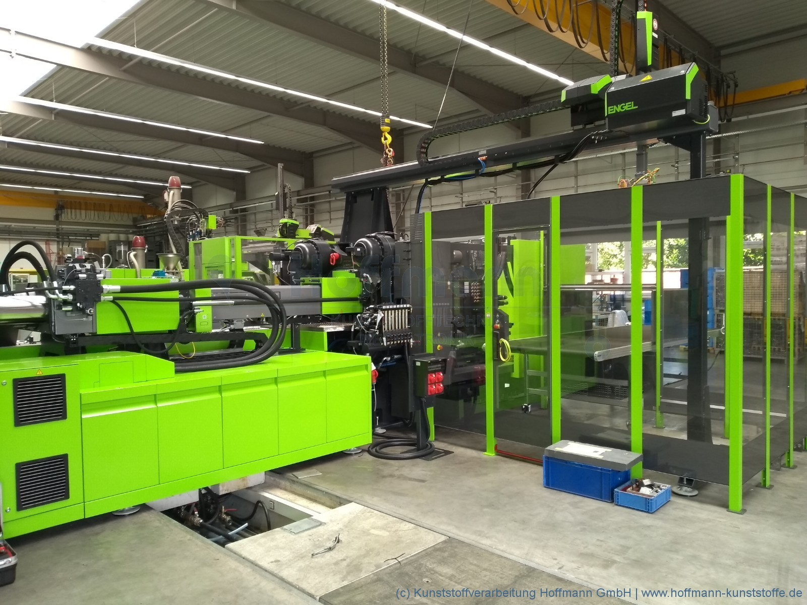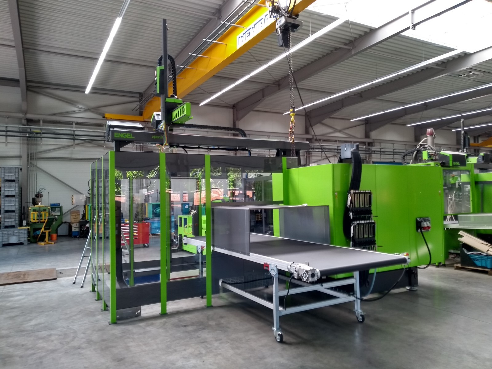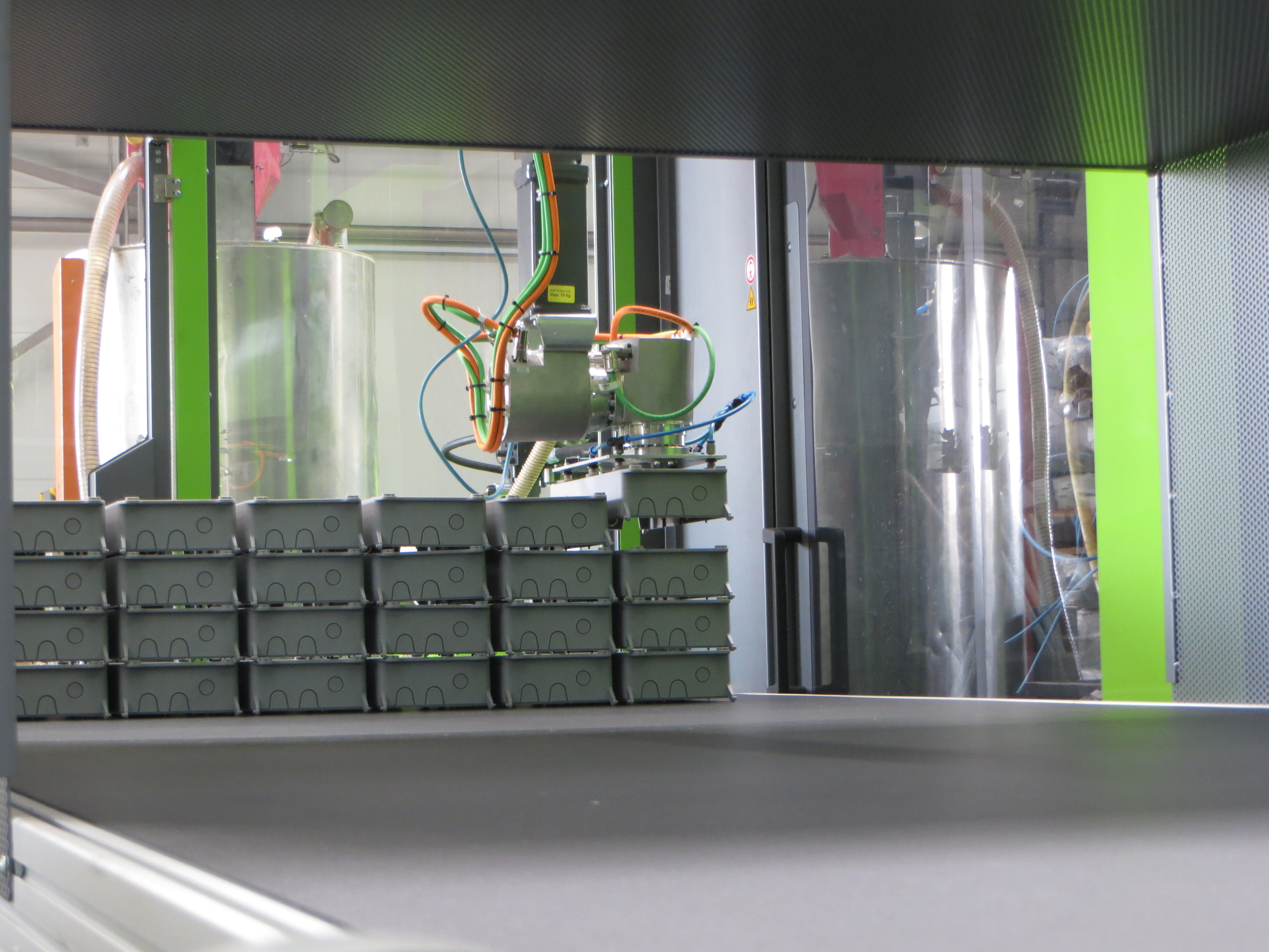 Unsere “Engel” und auch die anderen Maschinen haben im Juni 2019 Unterstützung einer Engel duo 550 erhalten. Sie verfügt über einen intelligenten Teile-Greifer sowie ein breites Band zum Abkühlen der fertigen Teile. Die fertigen Teile werden durch den Greifer ordentlich, vorsichtig und kompakt gestapelt abgelegt.