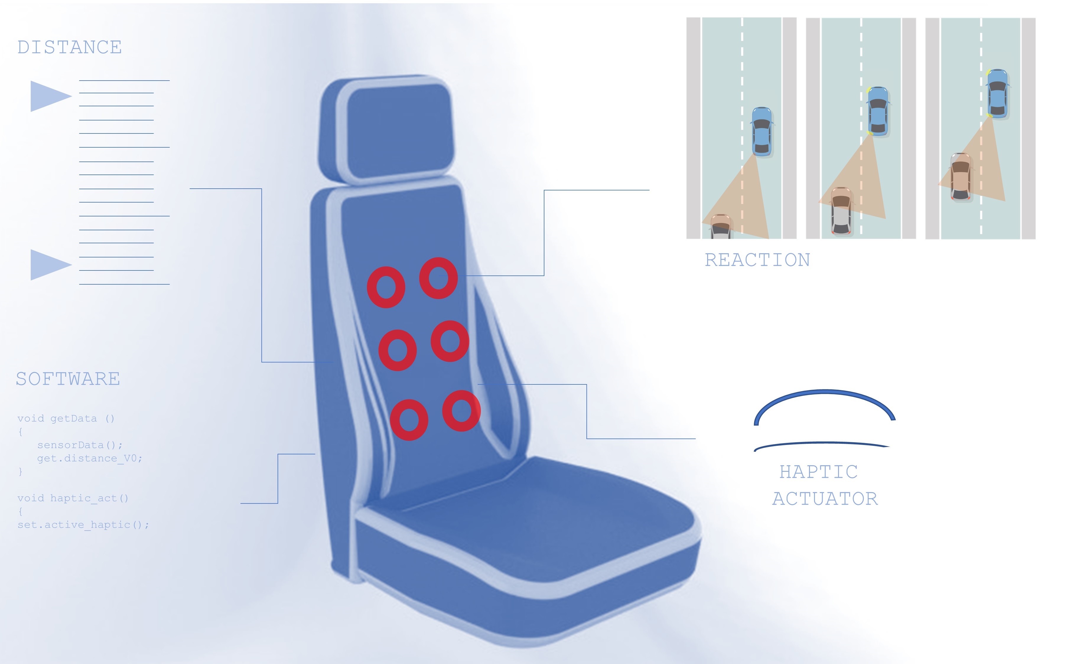 Im Projekt Smart Haptics arbeiten wir an einem Fahrzeugsitz der über eine Sensorkopplung die Fahrzeugumgebung scannt. Entsprechend der Gefahrenerkennung wird der Fahrer über eine Gefahrenlage über Druckreize informiert.