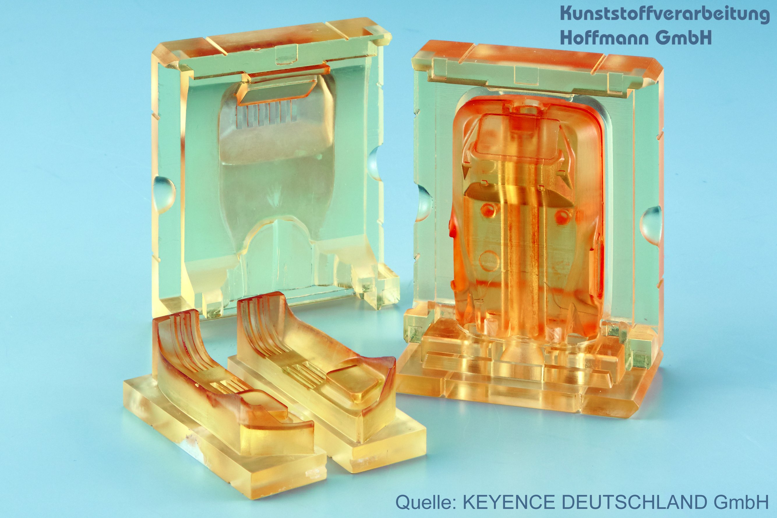 Printing the individual parts for a high-strength plastic injection mold. Another advantage of the printed mold is that it is partially transparent, making it easy to see and find any problems.